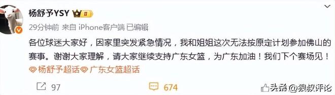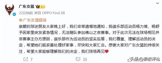北京时间10月14日,根据广东女篮球员杨舒予社交媒体发文:各位球迷大家好,因家里突发紧急情况,我和姐姐这次无法按原定计划参加佛山的赛事。谢谢大家理解,请大家继续支持广东女篮,为广东加油!我们下个赛场见。