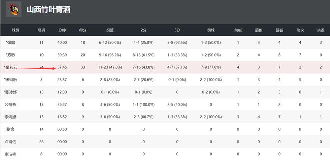 很明显发挥最好的当属翟若云,她全场比赛23中11,三分7中4,拿到33分7篮板2助攻1抢断,命中率47.8%,三分命中率57.1%,翟若云在末节一人狂揽11分,她就是山西女篮的绝对王牌。