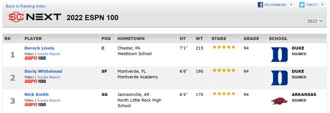 高中最后一年,小尼克史密斯曾是ESPN的全美第一分卫和全美第三高中生,排在他前面的分别是莱夫利和怀特黑德。