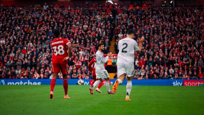 上半场结束,两队在安菲尔德的第100次交手,曼联1-0暂时领先。