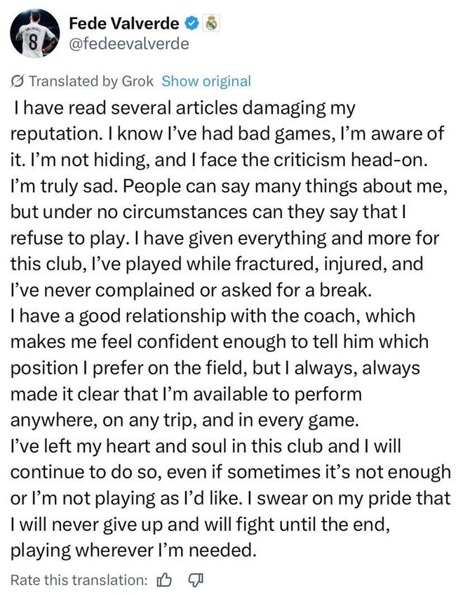 巴尔韦德在自己的社交媒体上写道:“人们可以对我提出各种指摘,但无论如何都不能说我拒绝比赛。我为这家俱乐部付出了一切甚至更多,曾带着骨折和伤痛坚持上场,从未抱怨或要求休息。”从加盟皇马开始到现在已经过去了8年时间,巴尔韦德也从年轻小将成长为皇马的亿元先生,而且逐渐成为了队内不可或缺的一员,西媒对他的无理指摘确实让球员很难接受。