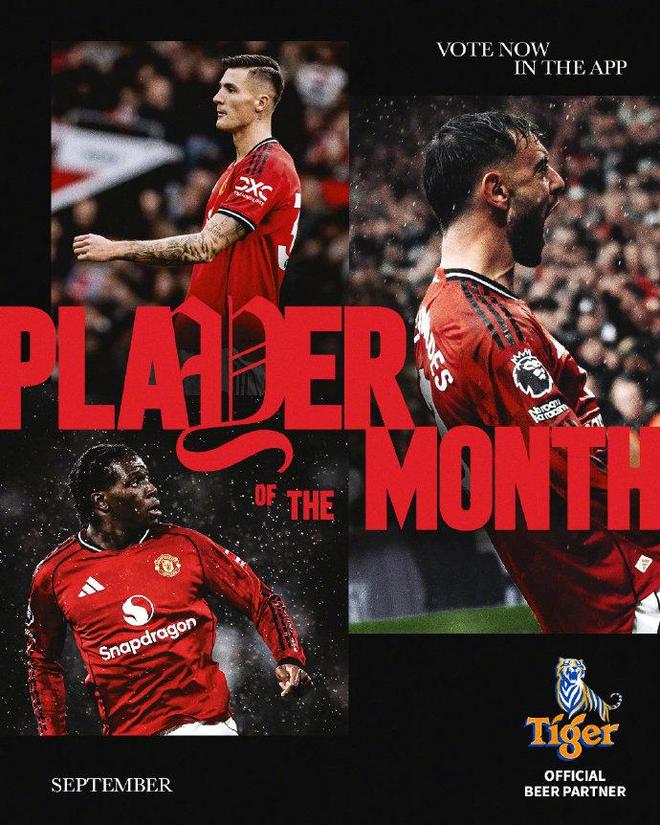 雷速体育10月1日讯 曼联官方发布了曼联9月最佳球员的候选名单,分别是谢什科、B费和多尔古。
