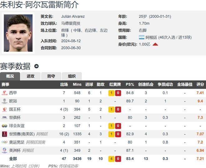 现年25岁的阿尔瓦雷斯如今身价高达1亿欧元,以目前阿尔瓦雷斯的年纪和状态,下次德转更新,阿尔瓦雷斯的身价还会进一步提升。去年夏窗,曼城7500万欧元就卖掉了阿尔瓦雷斯,马竞捡到了宝,上赛季57场29球8助算是小试牛刀。